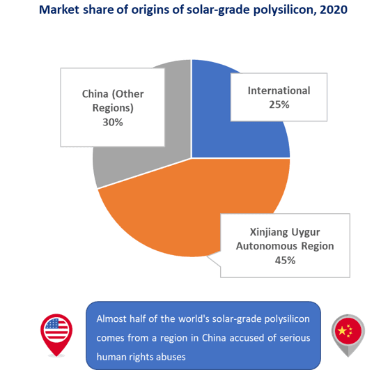 Die Solar Energy Industries Association veröffentlichte im Jahr 2023, dass die US-Solarinstallationen in diesem Jahr aufgrund des Verbots chinesischer Waren nach Bedenken wegen Zwangsarbeit um 23 % sinken könnten. Das Verbot hat die Einfuhr von Modulen aus der chinesischen Region Xinjiang, einer der Hauptquellen für US-amerikanische Solarausrüstung, zum Erliegen gebracht.