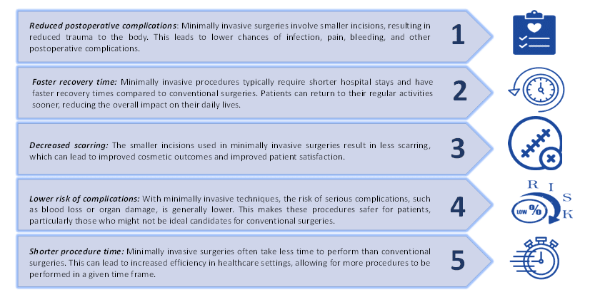 이 보고서는 최소 침습 수술의 장점이 향후 시장 성장을 주도하는 주요 요인 중 하나라고 제안합니다. 최소 침습 수술의 주요 장점 중 하나는 통증과 흉터를 줄여준다는 것입니다. 이러한 시술 중에 발생하는 작은 절개는 조직 손상을 줄여 환자의 수술 후 불편함을 줄입니다. 또한 이러한 수술과 관련된 최소한의 흉터는 미용적 결과와 환자 만족도를 향상시킵니다. 최소 침습 수술의 또 다른 장점은 입원 기간이 짧다는 것입니다. 이러한 수술은 일반적으로 회복 및 치유 시간이 짧기 때문에 환자는 더 빨리 병원에서 퇴원하여 일상 활동을 더 빨리 재개할 수 있습니다. 이는 환자에게 도움이 될 뿐만 아니라 의료 시설의 부담을 줄여 비용 절감 효과도 가져옵니다.