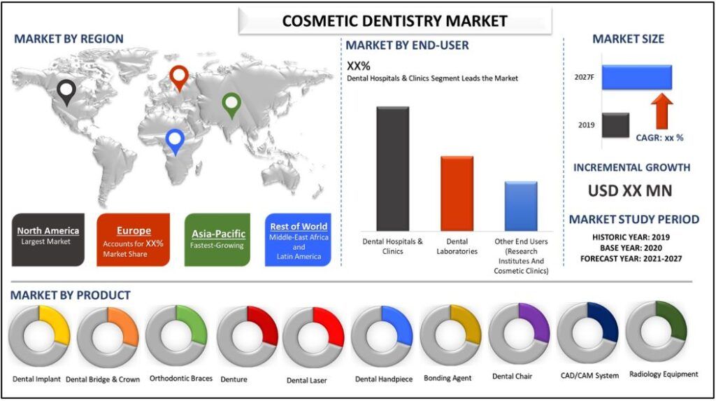 Cosmetic Dentistry Market was valued at US$ 20 billion in 2020 and is expected to grow at a CAGR of 7% over the forecast period (2021-2027). Nowadays, modern cosmetic dentistry gives a better smile, by treating stained, discolored, worn, chipped, broken, misaligned, misshapen teeth. Cosmetic dentistry is mainly divided into two specialties: orthodontics and prosthodontics. Orthodontics deals with the treatment of irregular and improper bites, which occur due to disproportionate tooth and jaw placement. Prosthodontics is concerned with the treatments like dental veneers, implants, or teeth whitening, which refers to the practice of rehabilitating and maintaining the health and appearance of teeth. The rise in the population opting for the improvement of dental aesthetics is intensifying the market growth. As per the American Academy of Cosmetic Dentistry (AACD) survey, 86 percent of the patients wanted to improve their dental aesthetics in 2017. Furthermore, the increase in geriatric population coupled with rising oral disorders, dental tourism, and development of technologically advanced solutions, and a rising number of dental laboratories investing in Computer-aided design (CAD) and Computer-aided manufacturing (CAM) technologies. For instance, in 2020, Align Technology acquired a software producer who’s a leading producer of open-architecture CAD/CAM software. This will further strengthen its dominant position within the U.S. digital dentistry market.