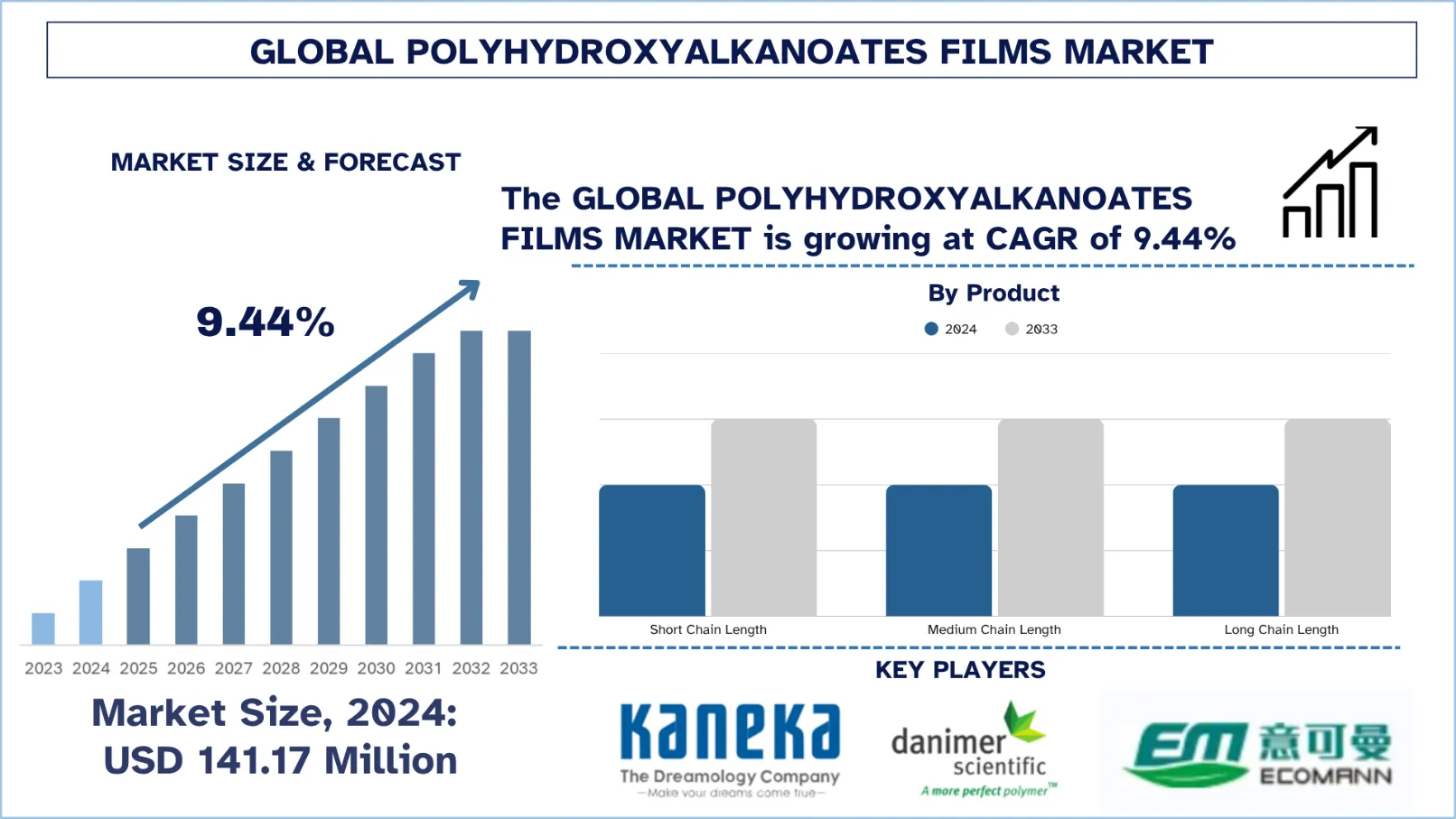 The Global Polyhydroxyalkanoates Films market was valued at USD 141.17 million in 2024 and is expected to grow at a robust CAGR of around 9.44% during the forecast period (2025-2033F), due to the rising bans on single-use plastics and mandates for biodegradable alternatives are pushing demand for PHA films in packaging and consumer goods.